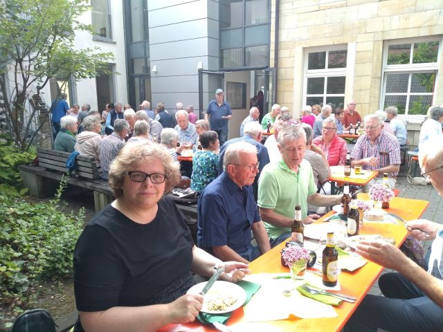 Der Wetterbericht hatte gehalten was er versprochen hatte und über 60 Senioren hatten sich bei herrlichem Sommerwetter auf der Terrasse des Torhauses am Kirchplatz eingefunden um gemeinsam ein paar schöne Stunden in gemütlicher Atmosphäre bei Gegrilltem, leckeren Salaten, selbst gebackenen Brotspezialitäten und kühlen Getränken zu genießen. Pünktlich zum 17.00 Uhr Glockenschlag der Turmuhr hieß Anne Loosen, Seniorenbeauftragte der Kolpingsfamilie, die zahlreichen Gäste willkommen. Gemeinsam wurde der kürzlich verstorbenen Elsbeth Mühlenbeck gedacht und mit dem Lied „Großer Gott wir loben dich“ das Grillfest eröffnet. Bereits am frühen Nachmittag hatte das Organisationsteam die Terrasse in einen mit Blumen dekorierten „Gourmetgarten“ verwandelt. Christian Wöstmann und Alois Veelker sorgten für Gutes vom Grill und hatten alle Hände voll zu tun um der Nachfrage am Buffet gerecht zu werden. Auch Pfarrer Marc Heilenkötter und das Königspaar Marielle Paschert und Christian Hüser hatten es sich nicht nehmen lassen sich unter die mutere Gästeschar zu mischen. Ungezwungen, heiter und bei bester Stimmung wurde bis in den späten Abend geklönt und bei sommerlichen Temperaturen fand das Grillfest einen fröhlichen Ausklang.