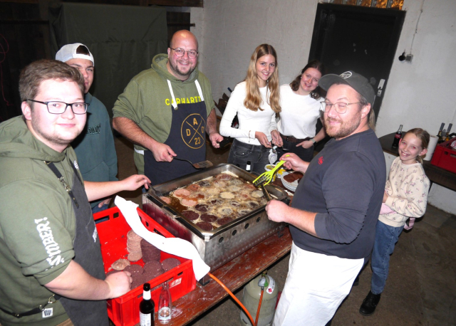 Für steten Nachschub von frisch gebratenem Wurst- und Leberbrot sorgten Justus Woit, Lukas Ahmann und Alex Weiper Bei prasselndem Kaminfeuer genossen fast 60 Gäste in gemütlicher Runde diesen für das Münsterland typischen, deftigen Gaumenschmaus mit leckeren Beilagen wie Rote Bete, Apfelkompott und frisch gebackenem Brot.